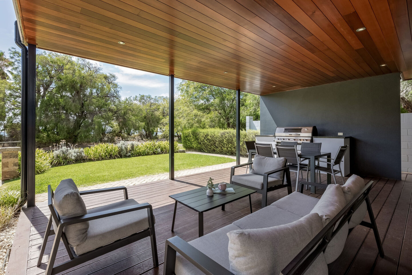 - Living area opens out onto large balcony with outdoor setting and barbecue.