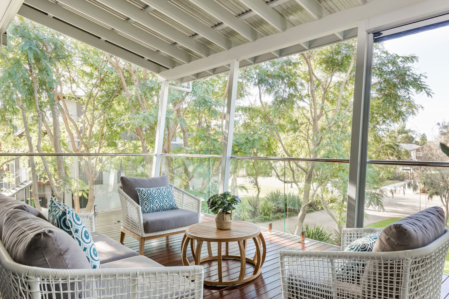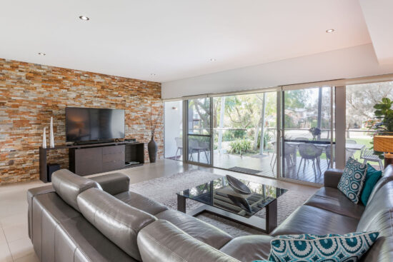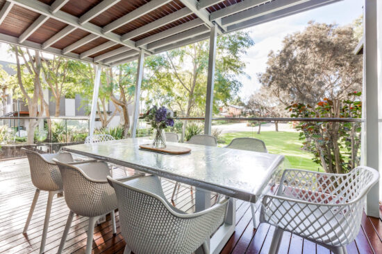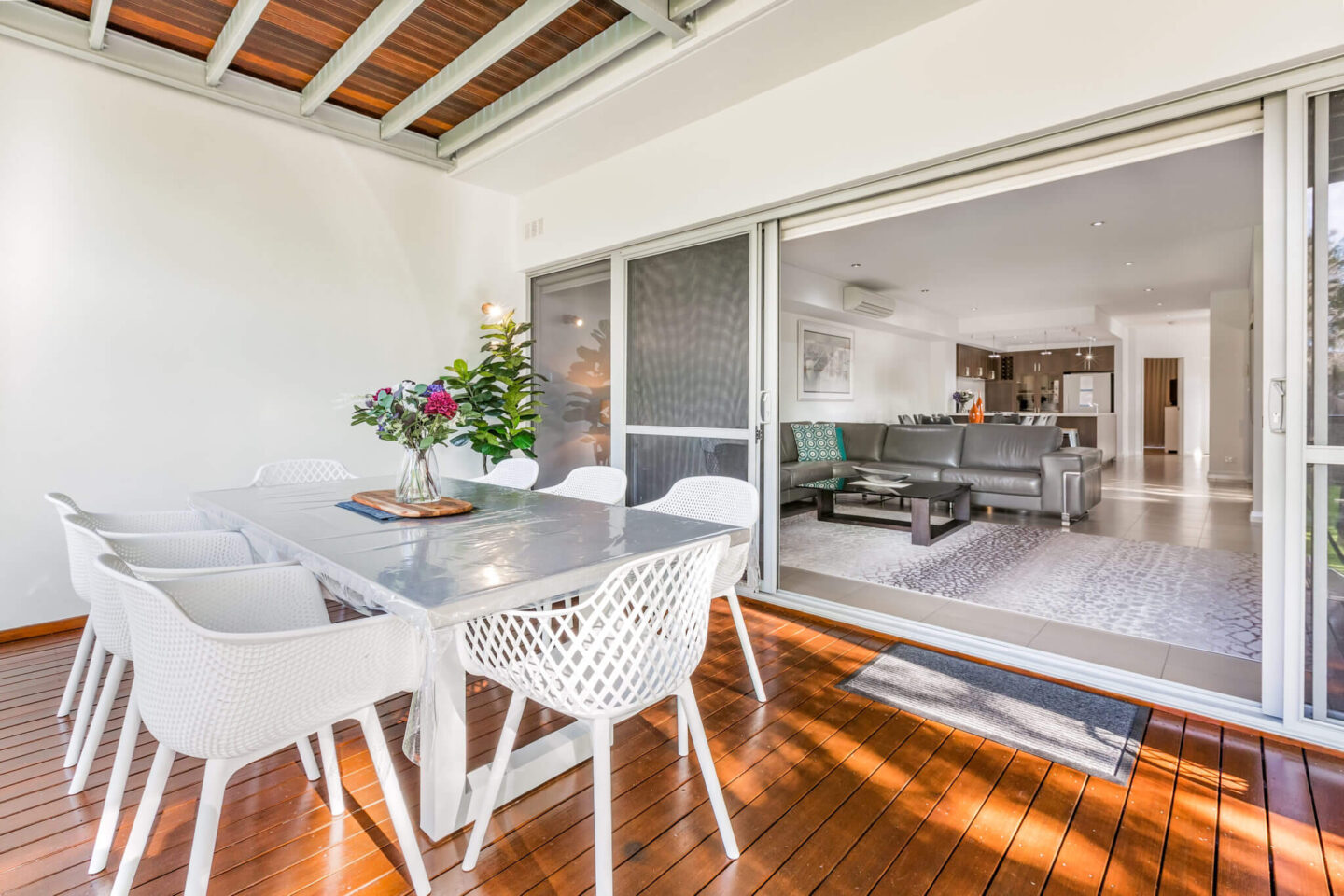 - Living area opens onto outdoor decked area with large outdoor dining table and BBQ.