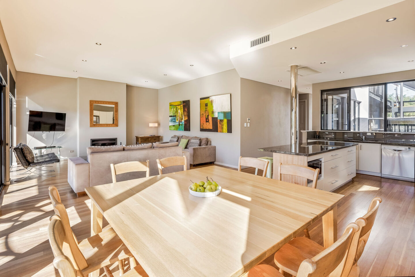 - Large fully equipped kitchen with open plan dining and living area opens onto a small grassed outdoor area.
