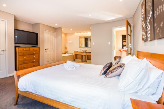- Downstairs consists of the master bedroom with ensuite/spa and 2nd bedroom has access to a 2nd bathroom on the ground floor that doubles as a powder room.