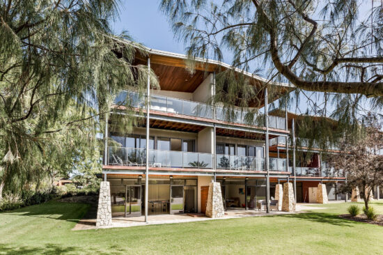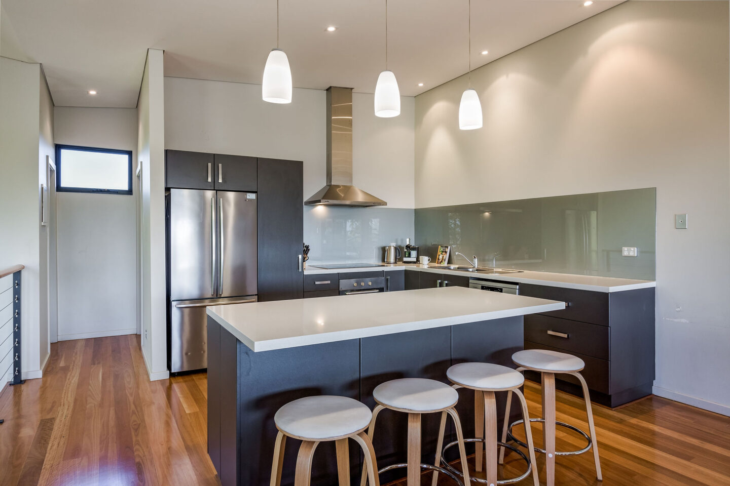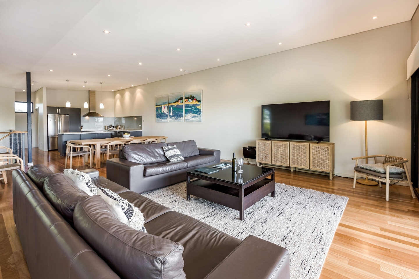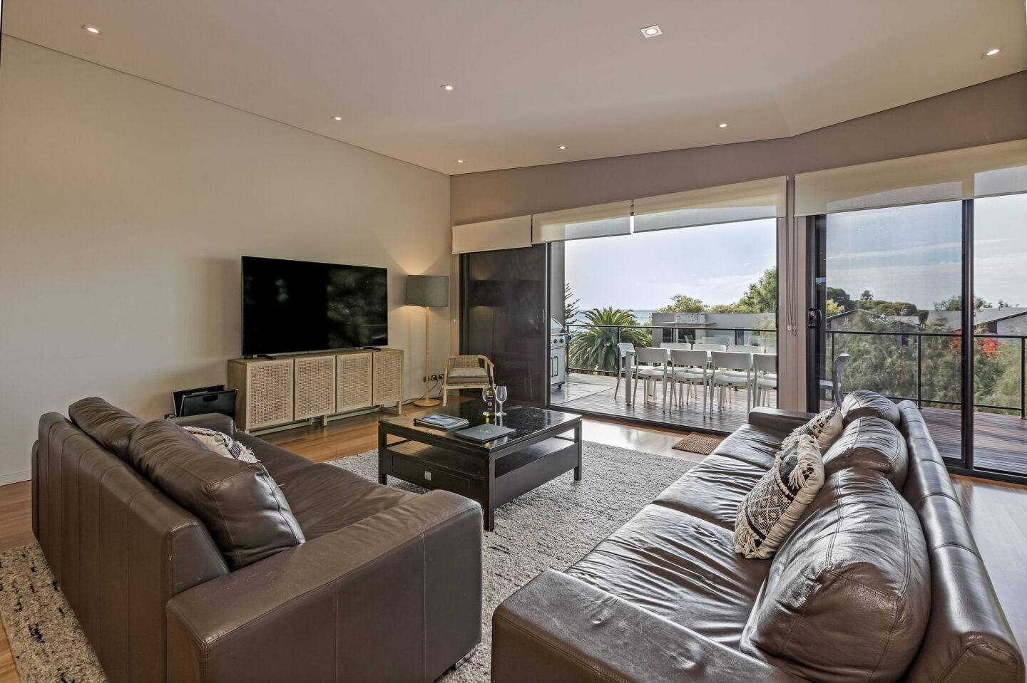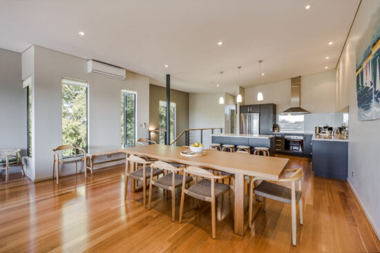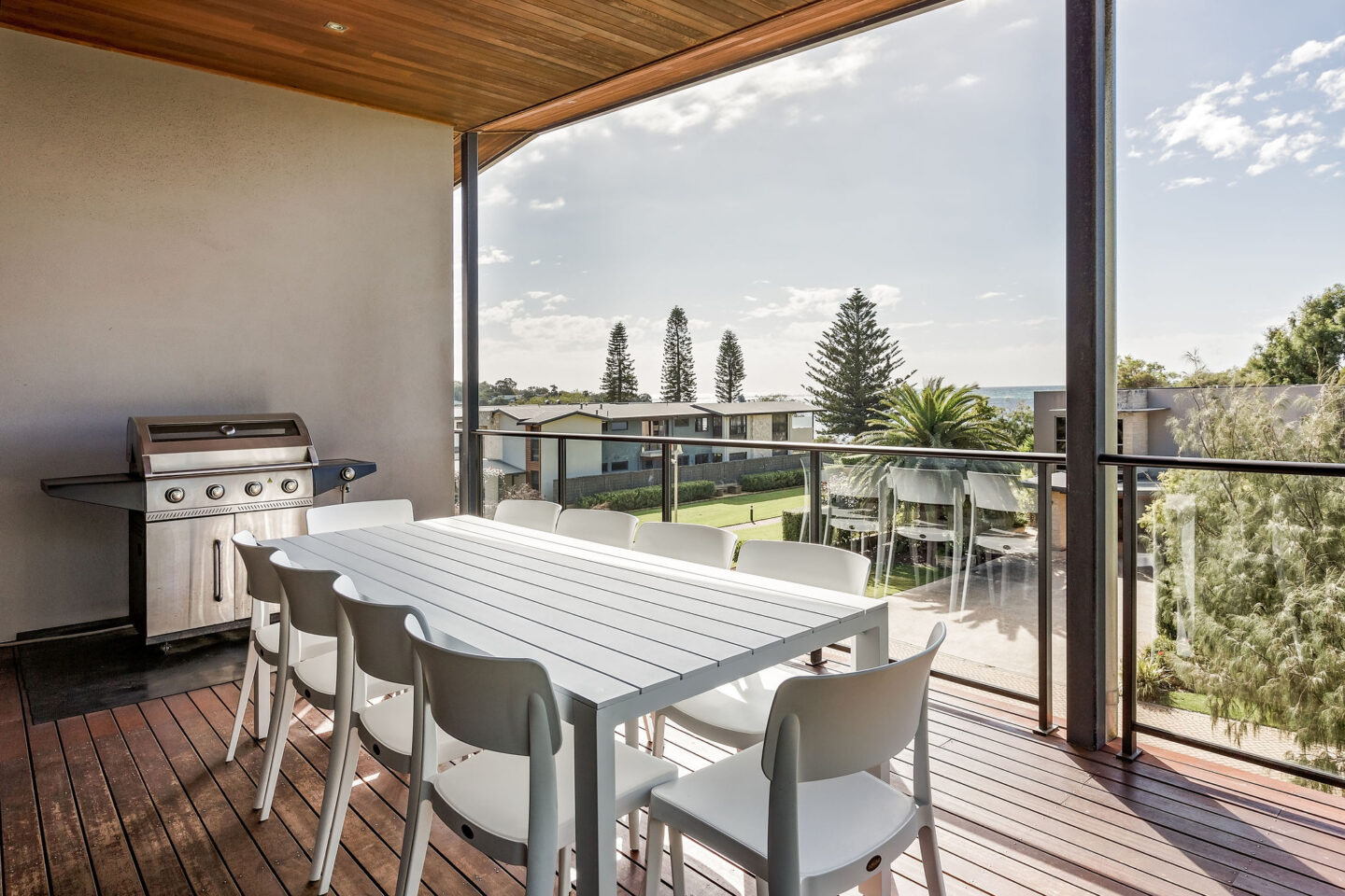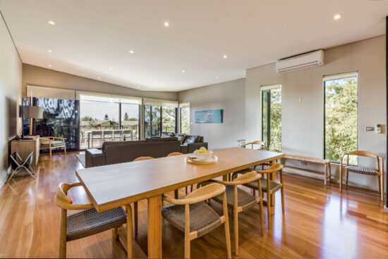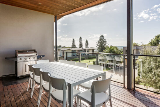 - The top floor consists of a large open plan kitchen, dining table for 10 and living area that opens out onto a large decked area with BBQ and outdoor table setting that has views over the beautiful Geographe bay beach. There is also a separate powder room along with reverse cycle A/C.