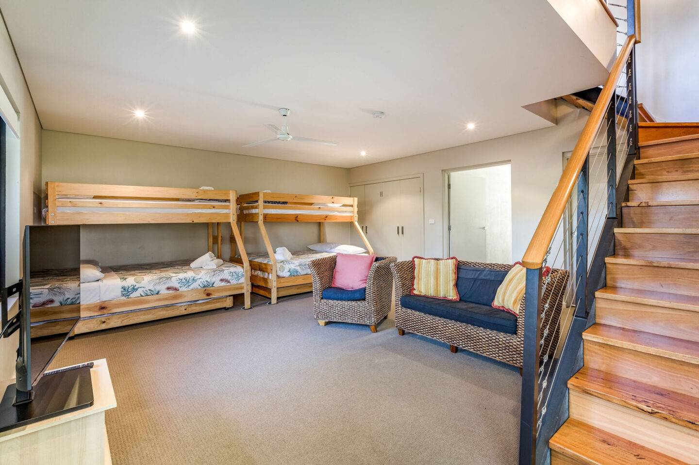 - The ground floor is the ultimate kids’ getaway and is the 4th bedroom which has 2 queen sized bunks with a single bed on top. It also has its own TV & DVD player along with a bathroom and laundry.