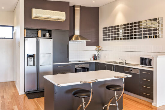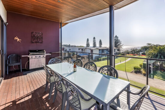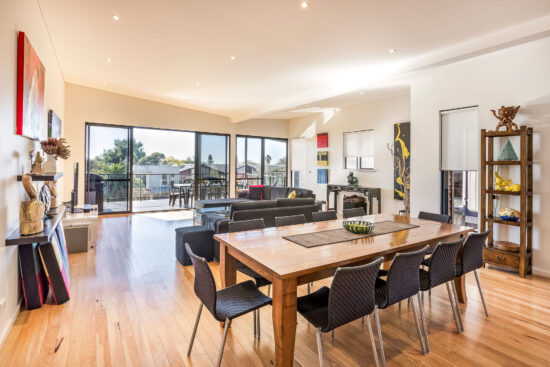 - The top floor consists of a large open plan kitchen, dining and living area that opens out onto a large decked area with BBQ and outdoor table setting that has views over the beautiful Geographe bay beach. There is also a separate powder room and reverse cycle air conditioning.