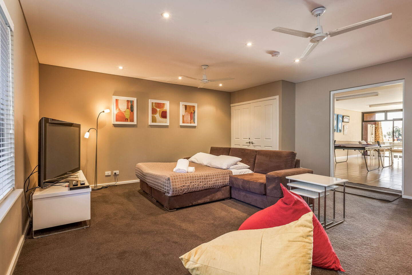 - The ground floor family room can be converted into a 4th bedroom with a large chase sofa bed/lounge. It also has its own TV & DVD player along with a bathroom and laundry.
