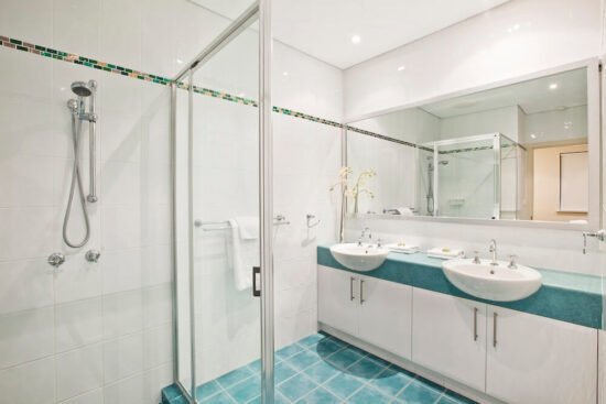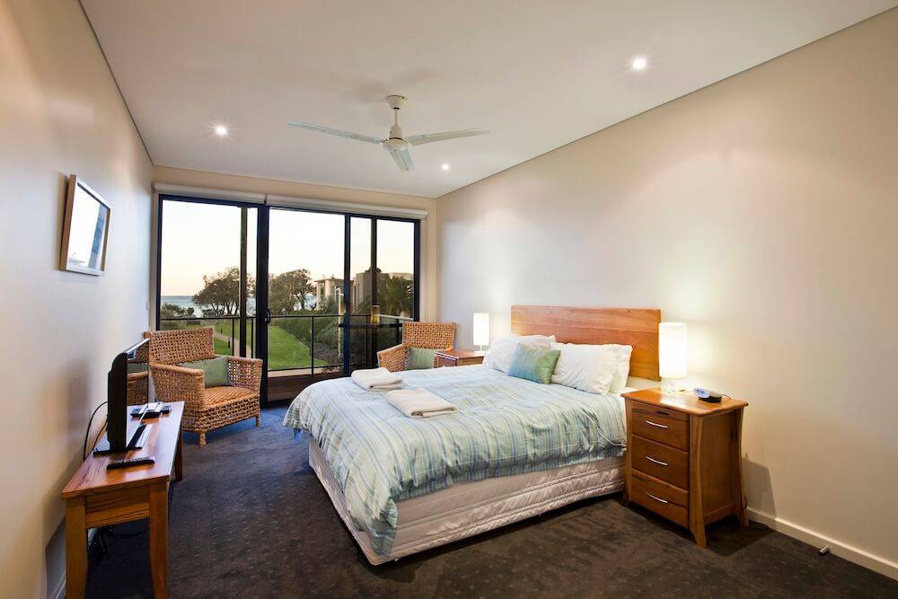 - The middle level off the entrance consists of 1 King room & 2 queen sized bedrooms all with their own ensuites with either a double shower or bath and reverse cycle A/C in all bedrooms. The front 2 also have views overlooking the bay.