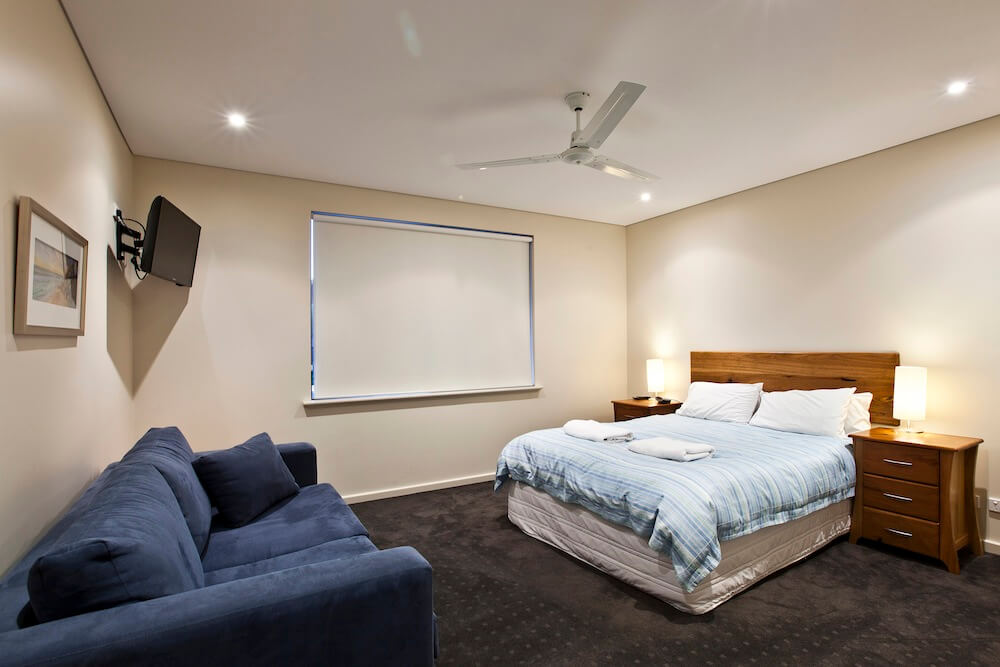 - Downstairs is a large bedroom with with a queen bed & 1 bunk bed. There is also a large TV and DVD player. There is another bathroom and fully equipped laundry. Both rooms are air conditioned.