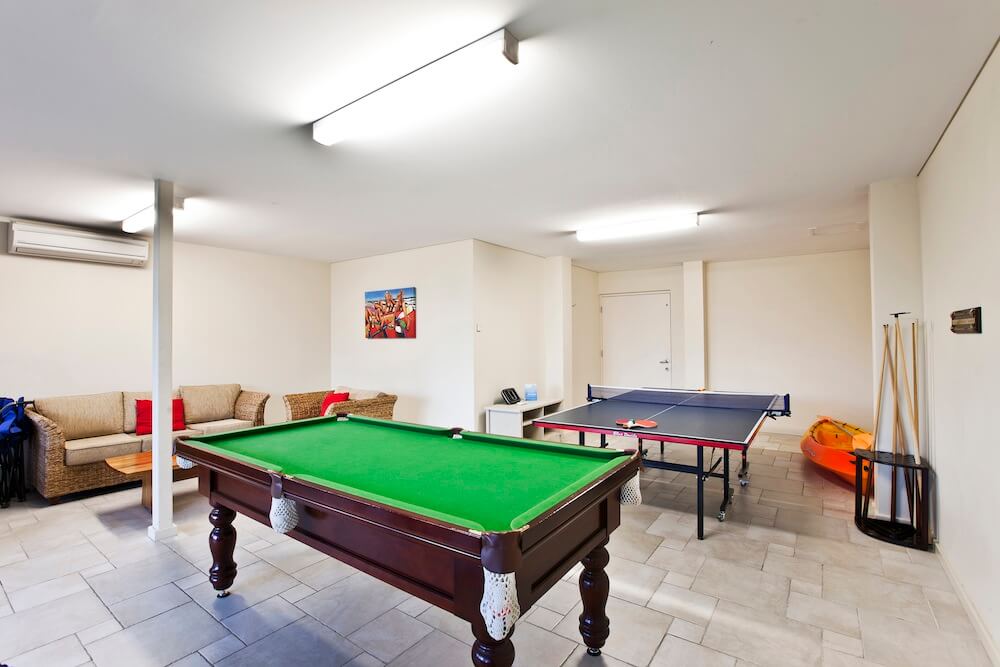 - The downstairs bedroom opens onto a large games room area complete with Pool table and table tennis. This opens onto a large grassed area looking down the path to the beach. There are also some bikes available for guest use.