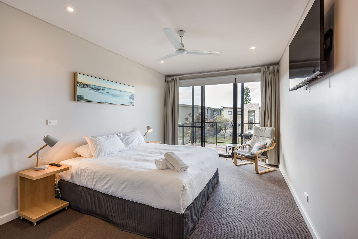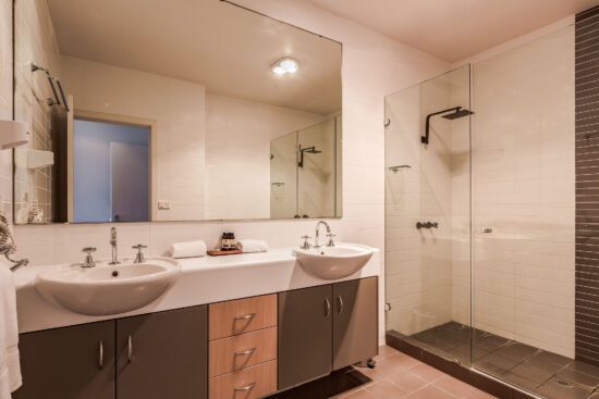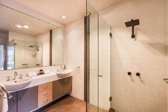 - The middle level off the entrance consists of 3 large bedrooms all with their own ensuites. The first queen sized room has a TV so you can relax and watch your favourite shows. The other 2 bedrooms on this level have a king sized bed (1 can be made into twin share). Both these rooms have own ensuite and open onto decked balcony.