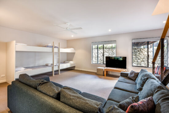 - Downstairs is a large bedroom with 2 sets of built in bunks along with a TV and DVD player. This has its own bathroom and fully equipped laundry.