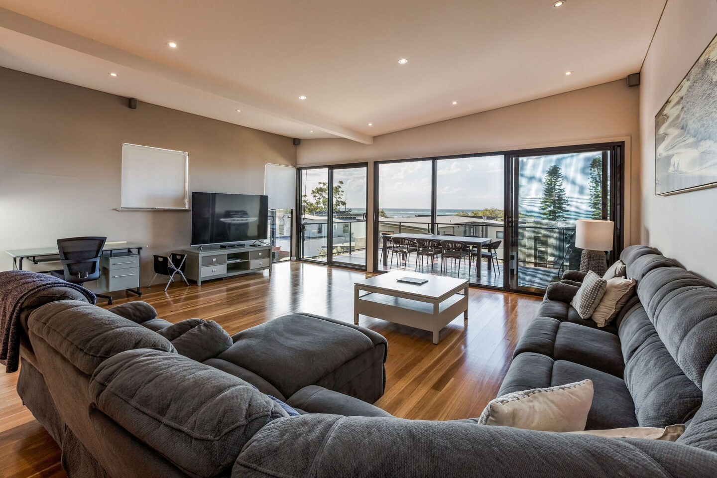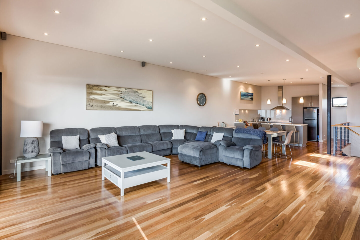 - Top level has open plan kitchen dining and living with an additional powder room. This opens out onto a large deck complete with BBQ and outdoor seating area with full ocean views.