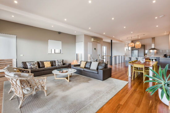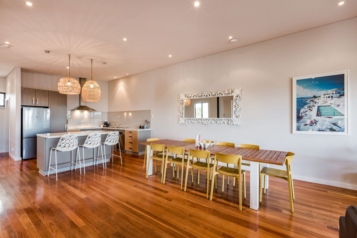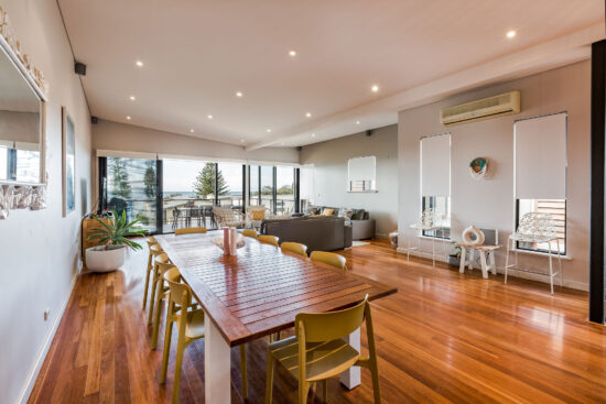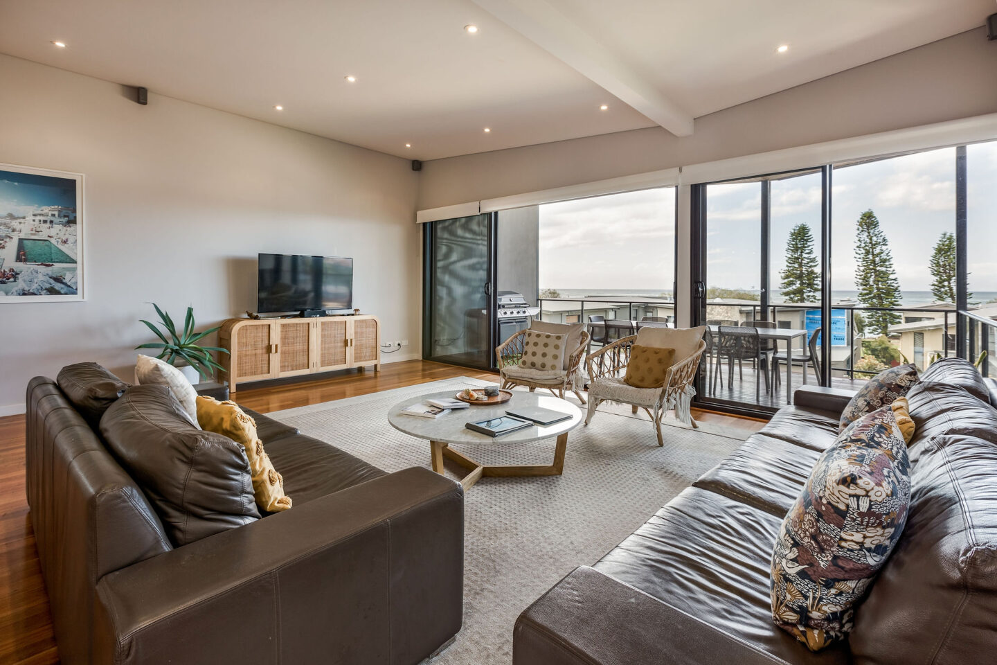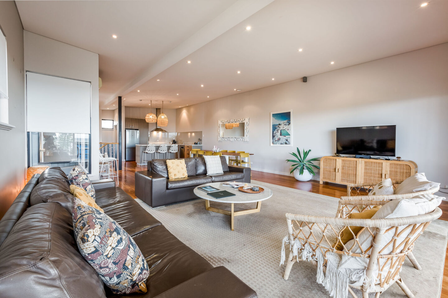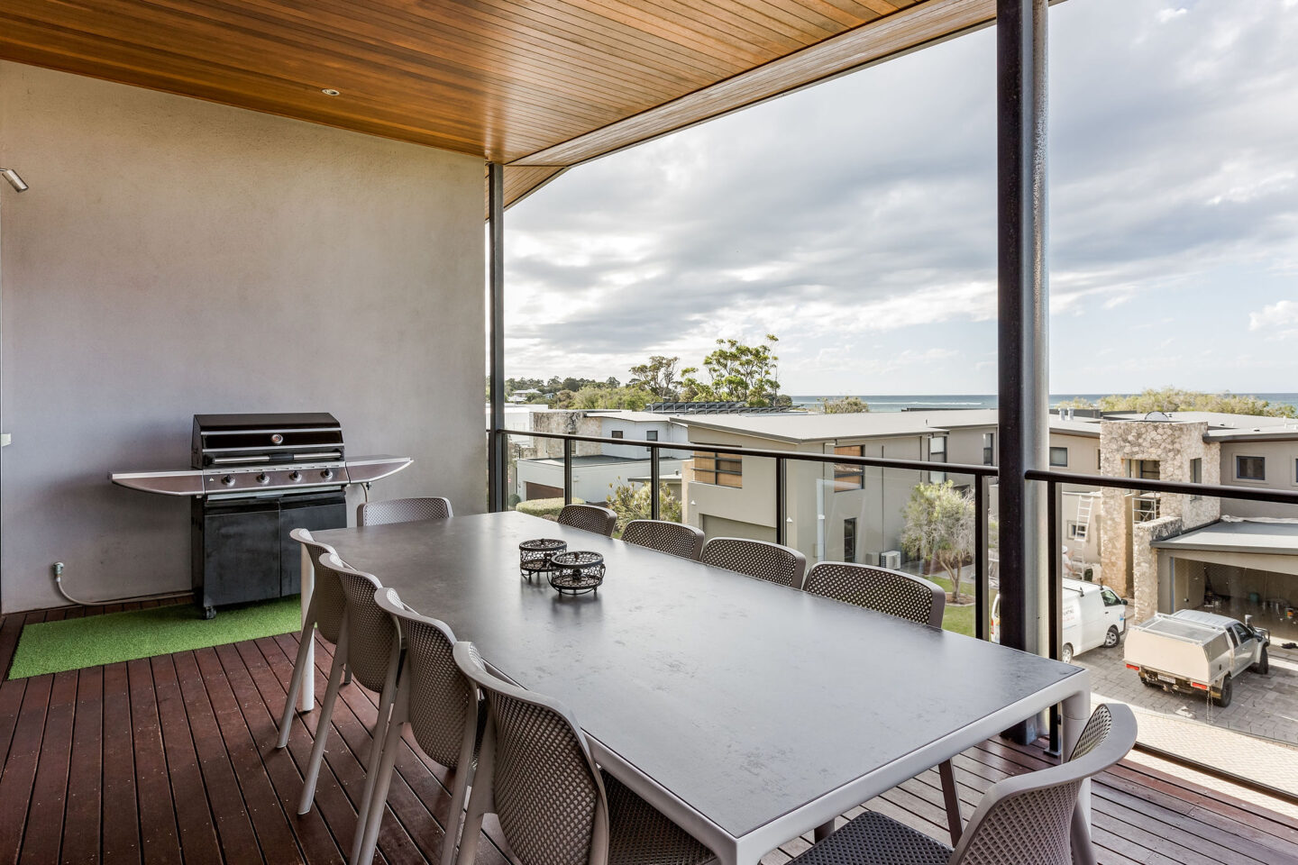 - Top level has open plan kitchen dining and living with an additional powder room. This opens out onto a large deck complete with BBQ and outdoor seating area with full ocean views.