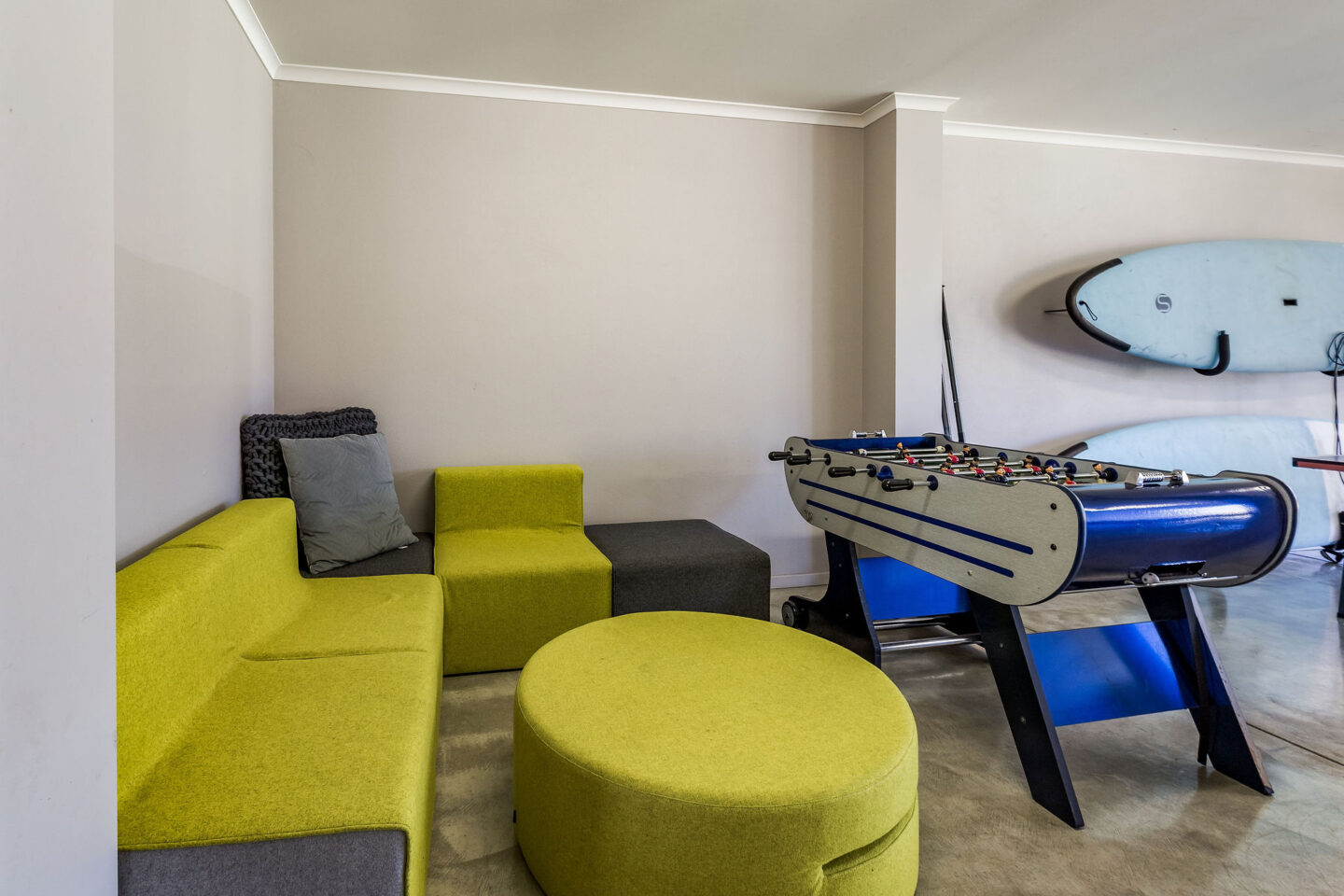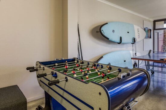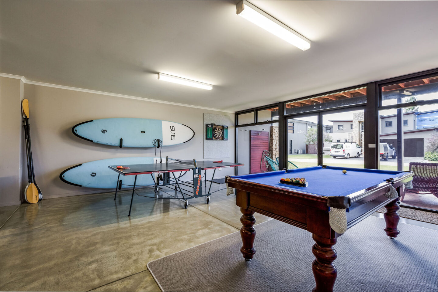 - The downstairs bedroom opens onto a large games room area complete with SUP’s (Stand Up Paddle Boards) Pool Table, table tennis & kayaks. This opens onto a large grassed area.