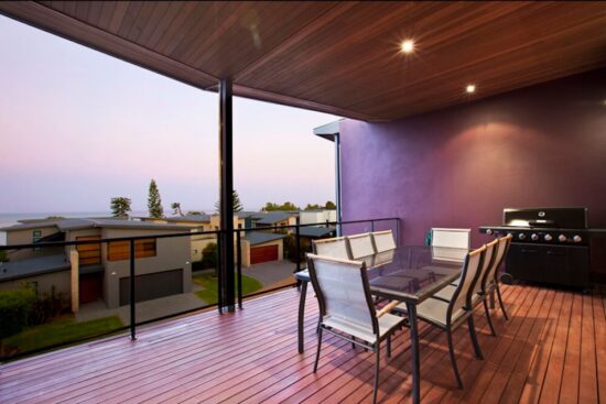 - Top level has open plan kitchen dining and living with an additional powder room. This opens out onto a large deck complete with BBQ and outdoor seating area with full ocean views.