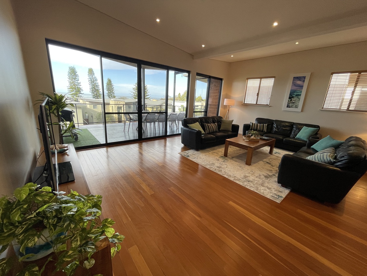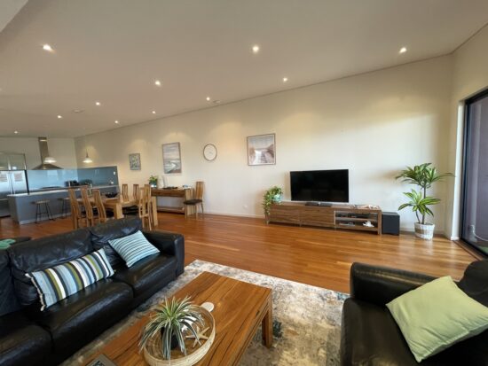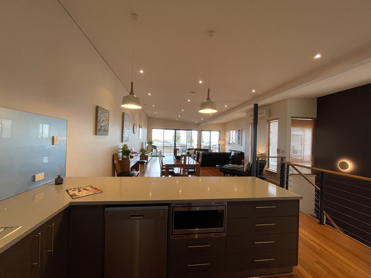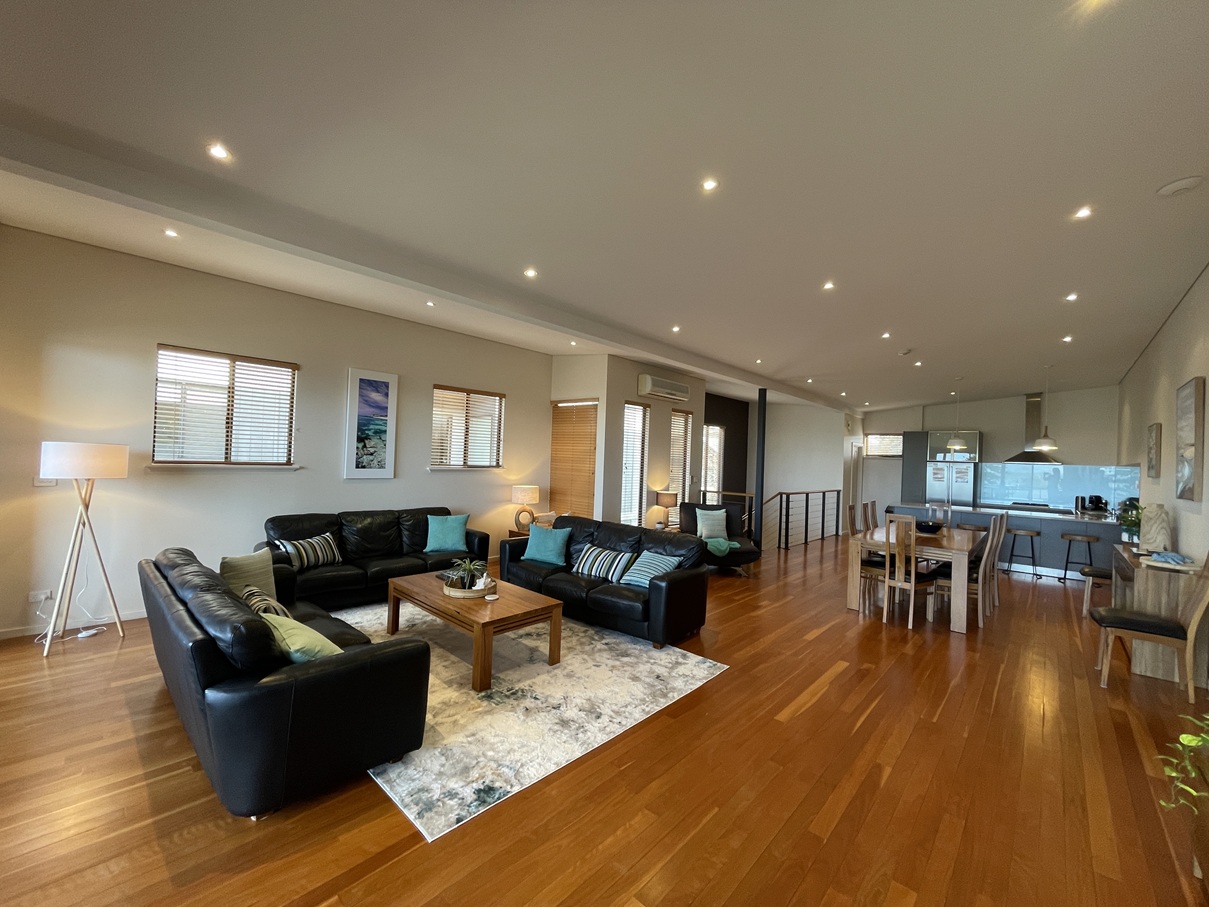 This spacious four-bedroom, three-bathroom home is designed with comfort and flexibility in mind. The entry-level features three king-size bedrooms—which can be converted into king singles to suit your needs on request. The master suite boasts a private ensuite, while the two ocean-facing bedrooms share access to a luxurious main bathroom complete with a large soaking spa bath.