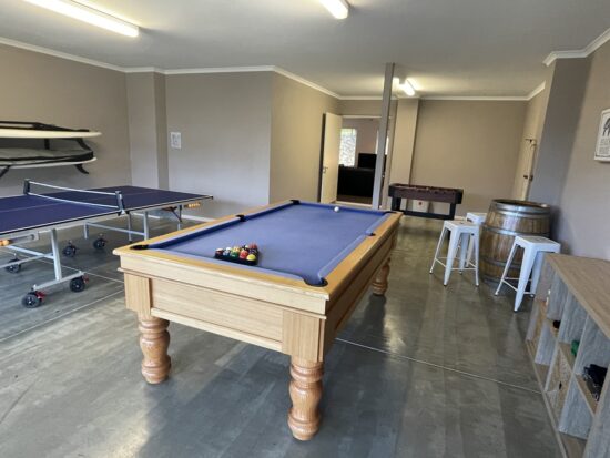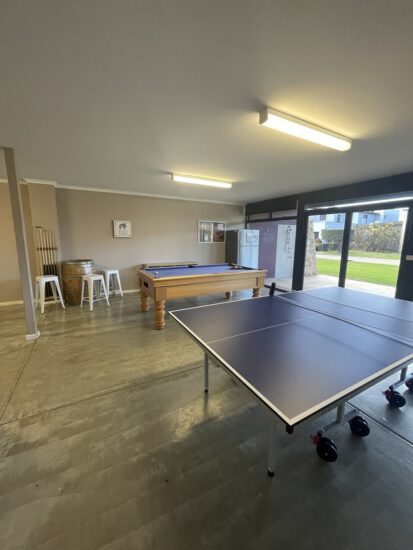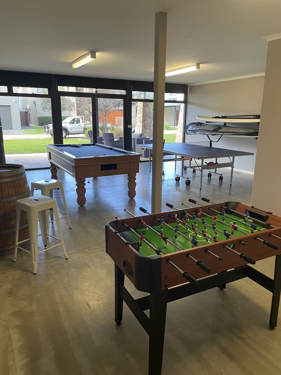 Entertainment is at the heart of this home, with a dedicated games room offering foosball, table tennis, and a pool table—perfectly connected to a generous grassy area outside, ideal for relaxing or entertaining. Two stand-up paddle boards are also available for guests eager to explore the sparkling waters of the bay, with an outdoor shower conveniently located for rinsing off after your adventures.