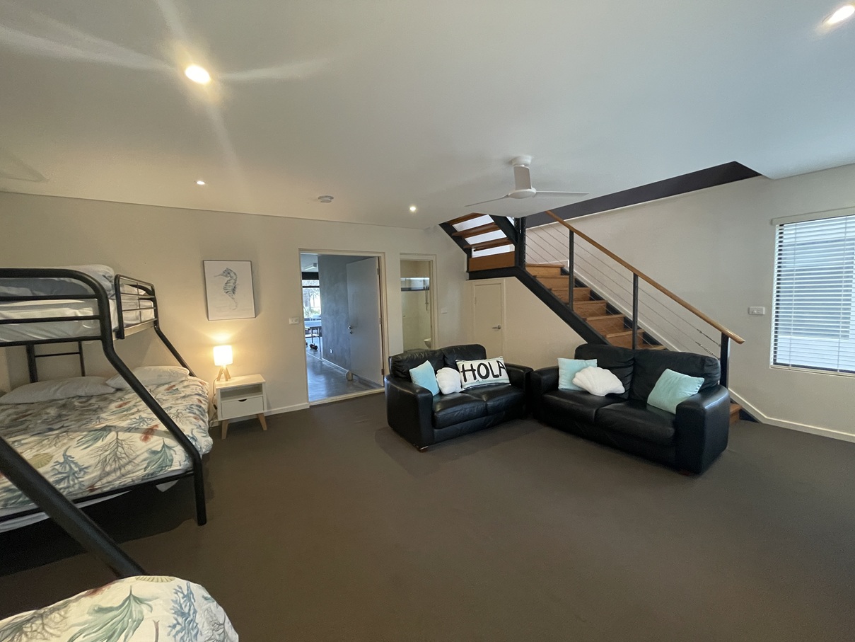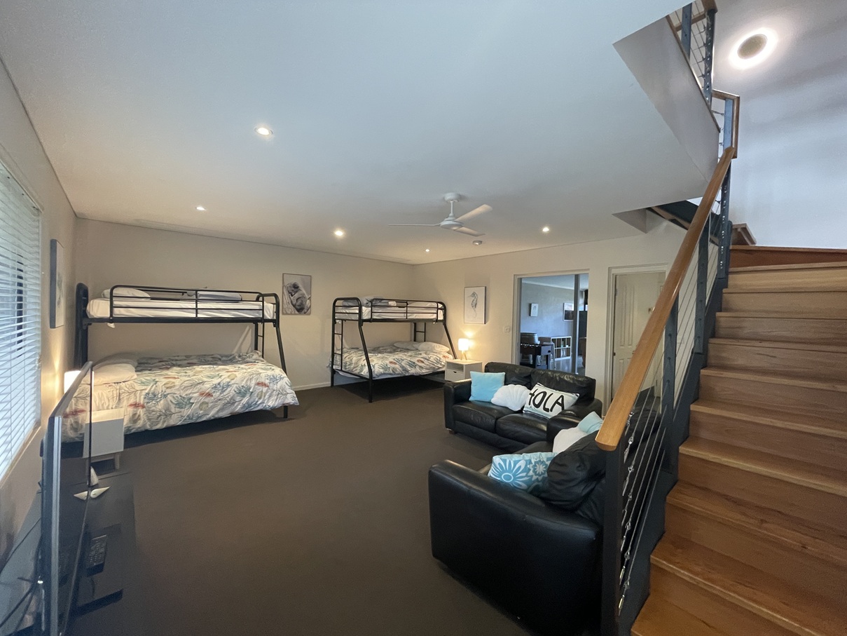 Downstairs, the fourth bedroom is ideal for families or groups, featuring two queen/single bunk beds, a separate bathroom, and full laundry facilities.